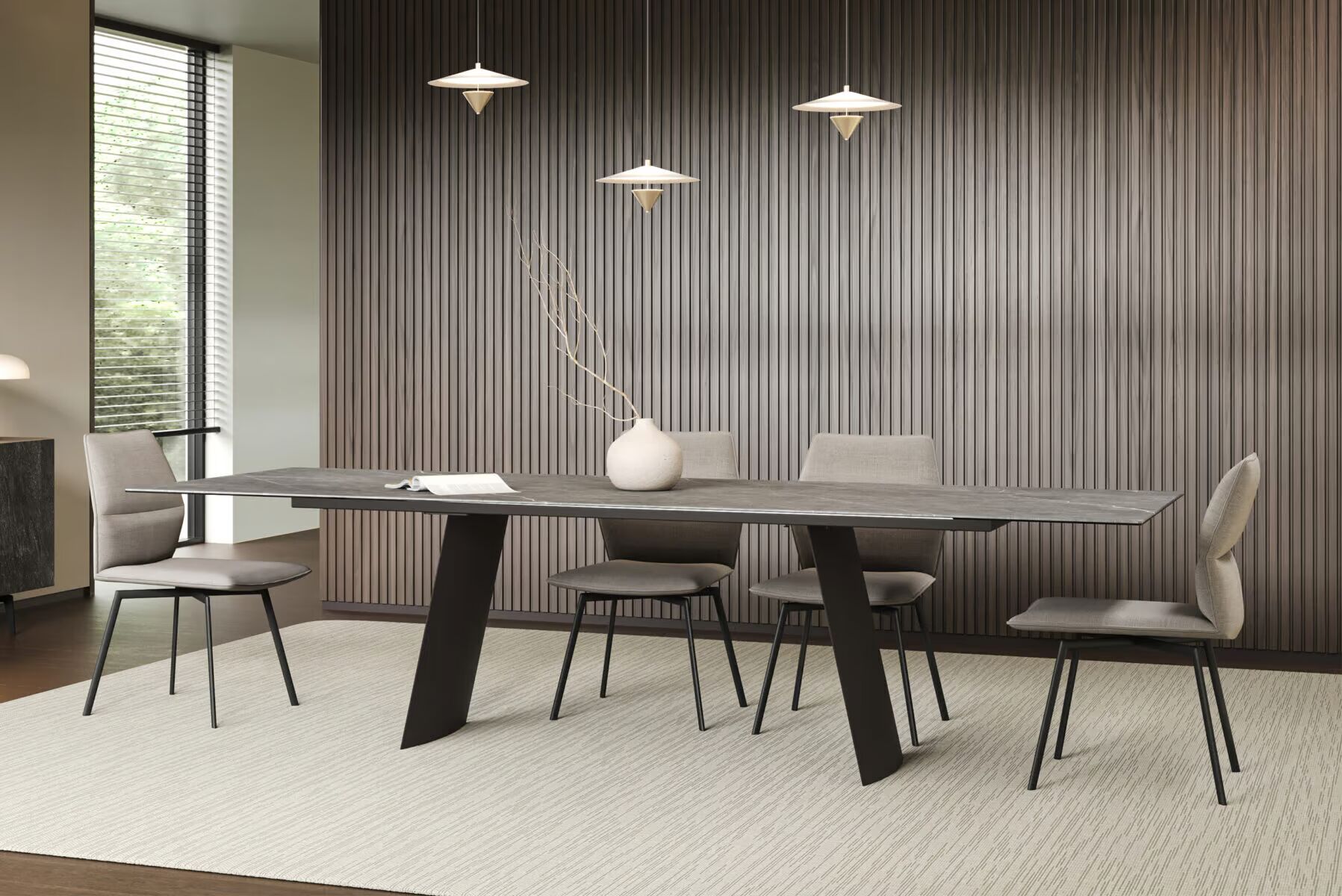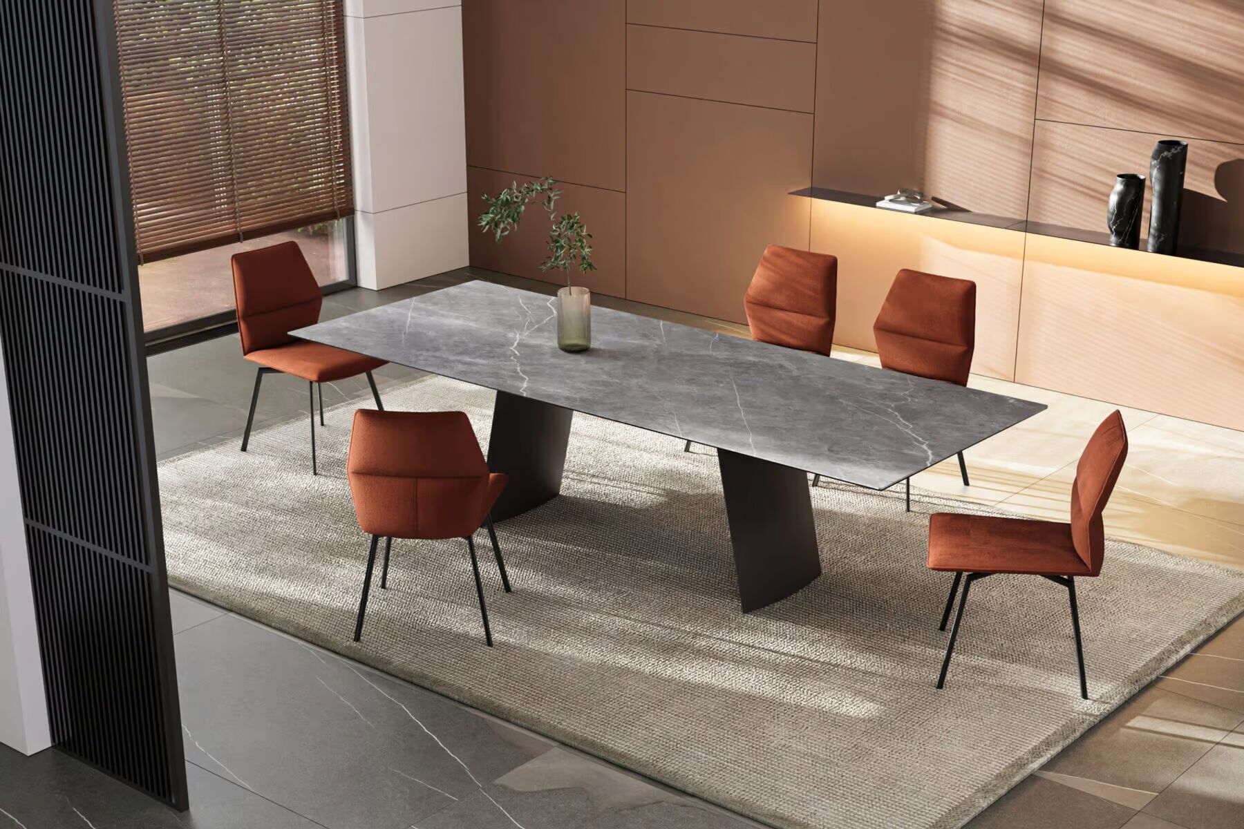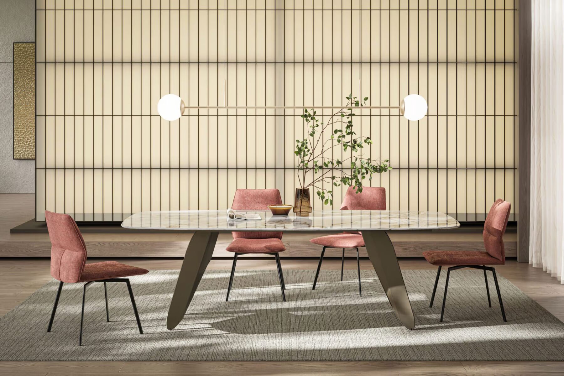 Посадка продумана так, чтобы необычная форма оставалась комфортной в повседневном использовании. Эргономичная спинка поддерживает корпус, а мягкое сиденье делает стул удобным как для коротких встреч, так и для продолжительных ужинов. Металлические ножки подчёркивают лёгкость конструкции и усиливают ощущение графичности.