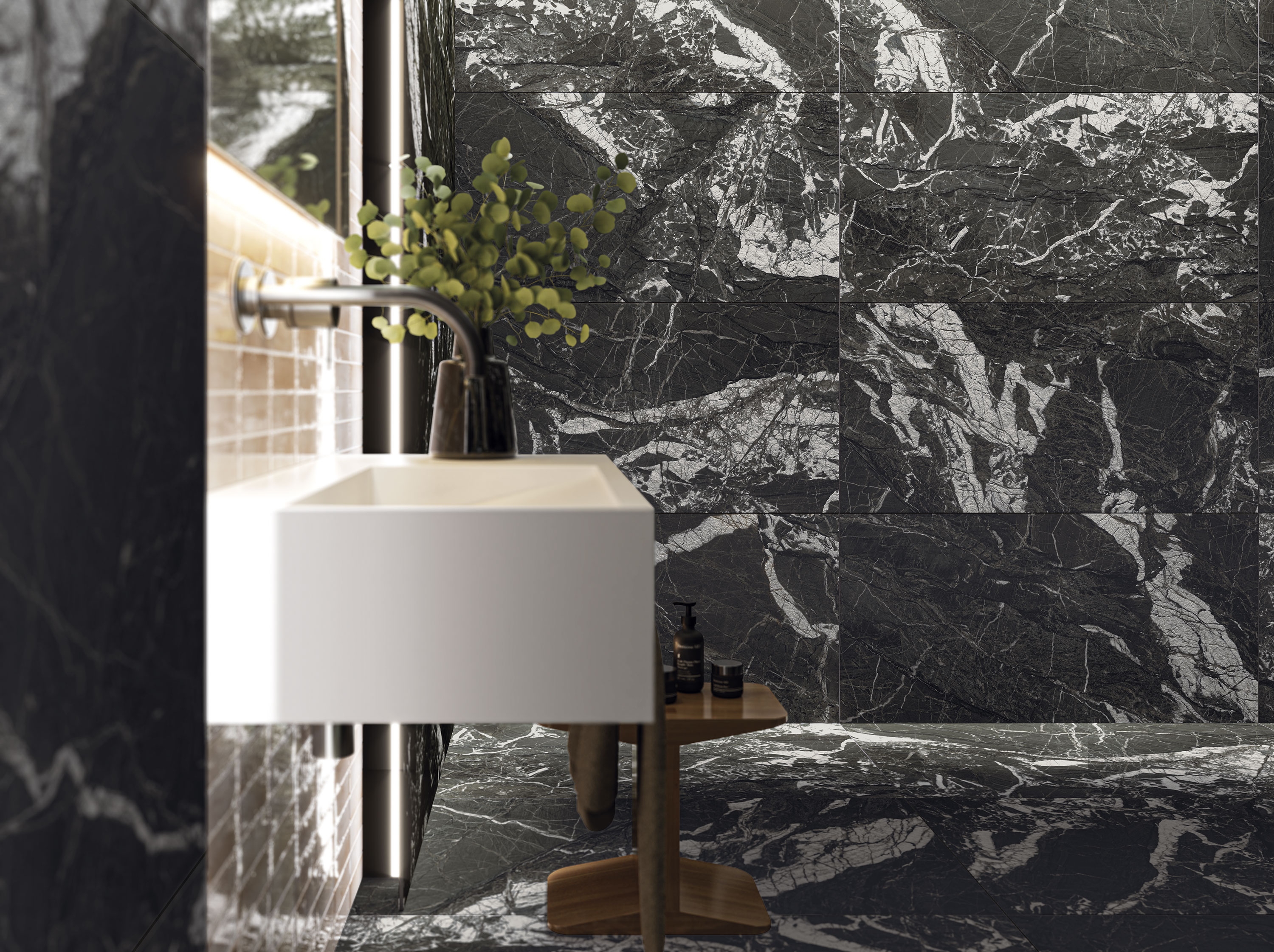 В коллекции Arvora использована технология Artech для достижения исключительной детализации и реалистичности поверхности. Рельефное покрытие точно воспроизводит текстуру натурального черного мрамора с художественным расположением прожилок.