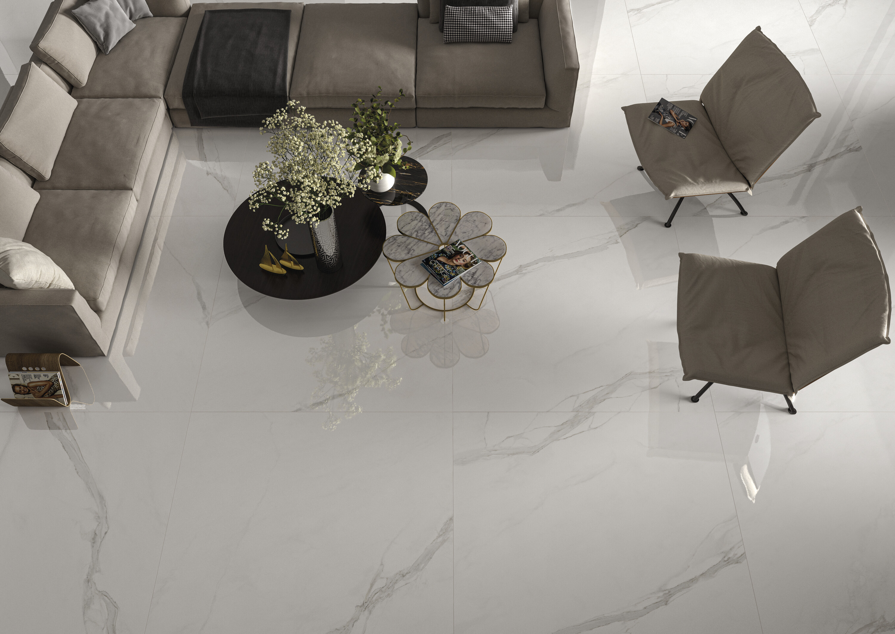 Доступная в светлом тоне и двух вариантах отделки (полированный и матовый), плитка толщиной 8 мм отличается легкостью и прочностью и подходит для пола и стен.