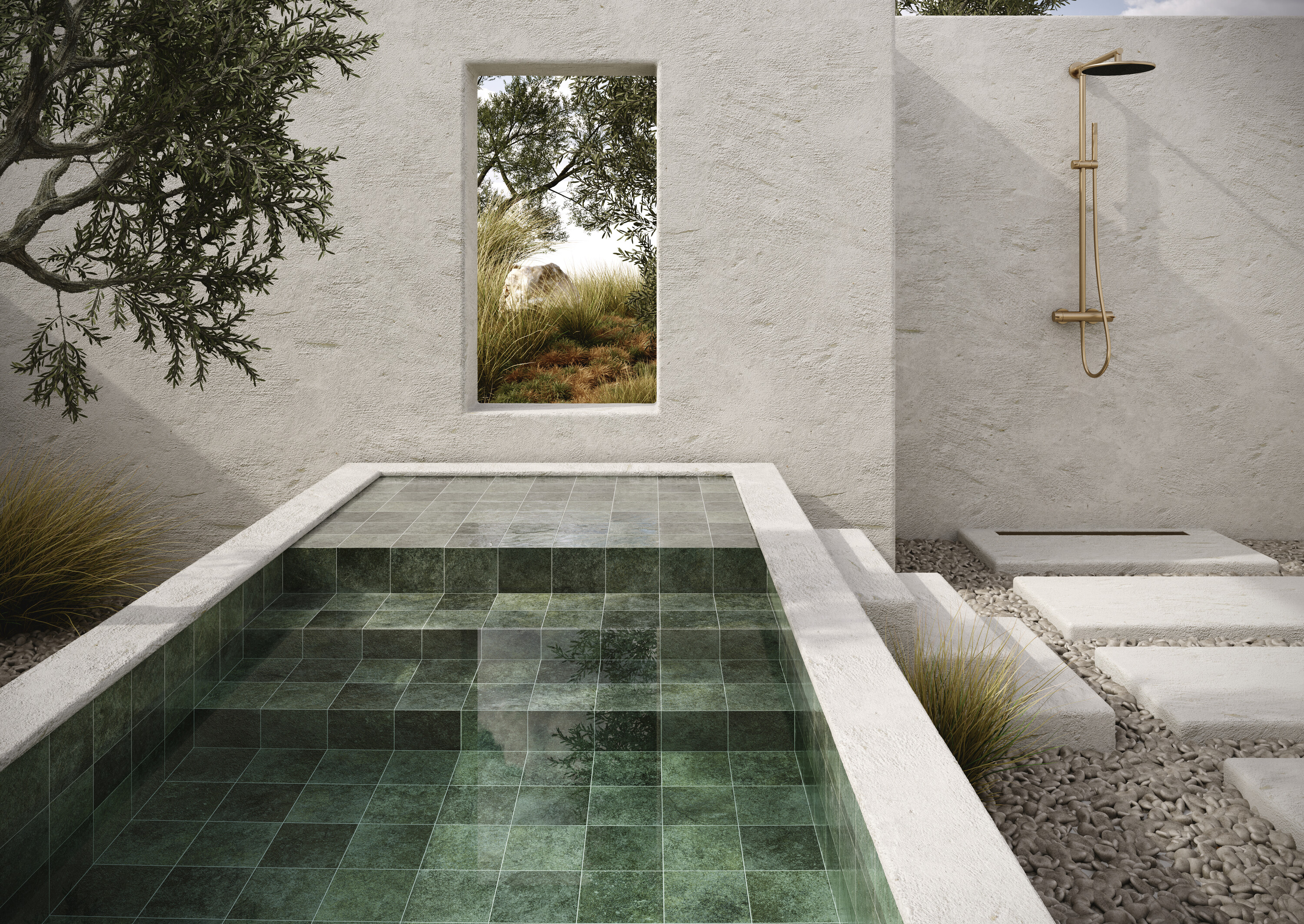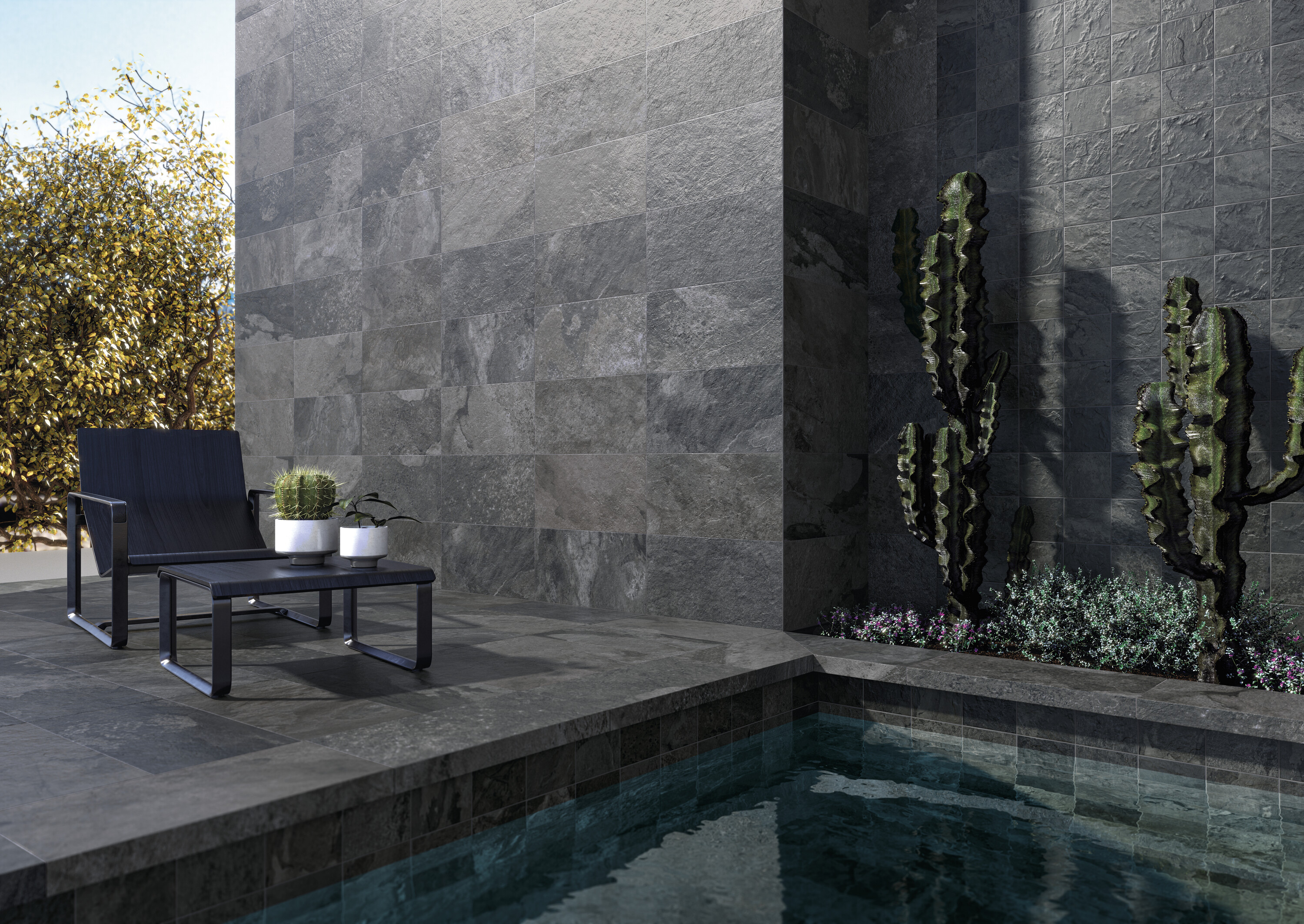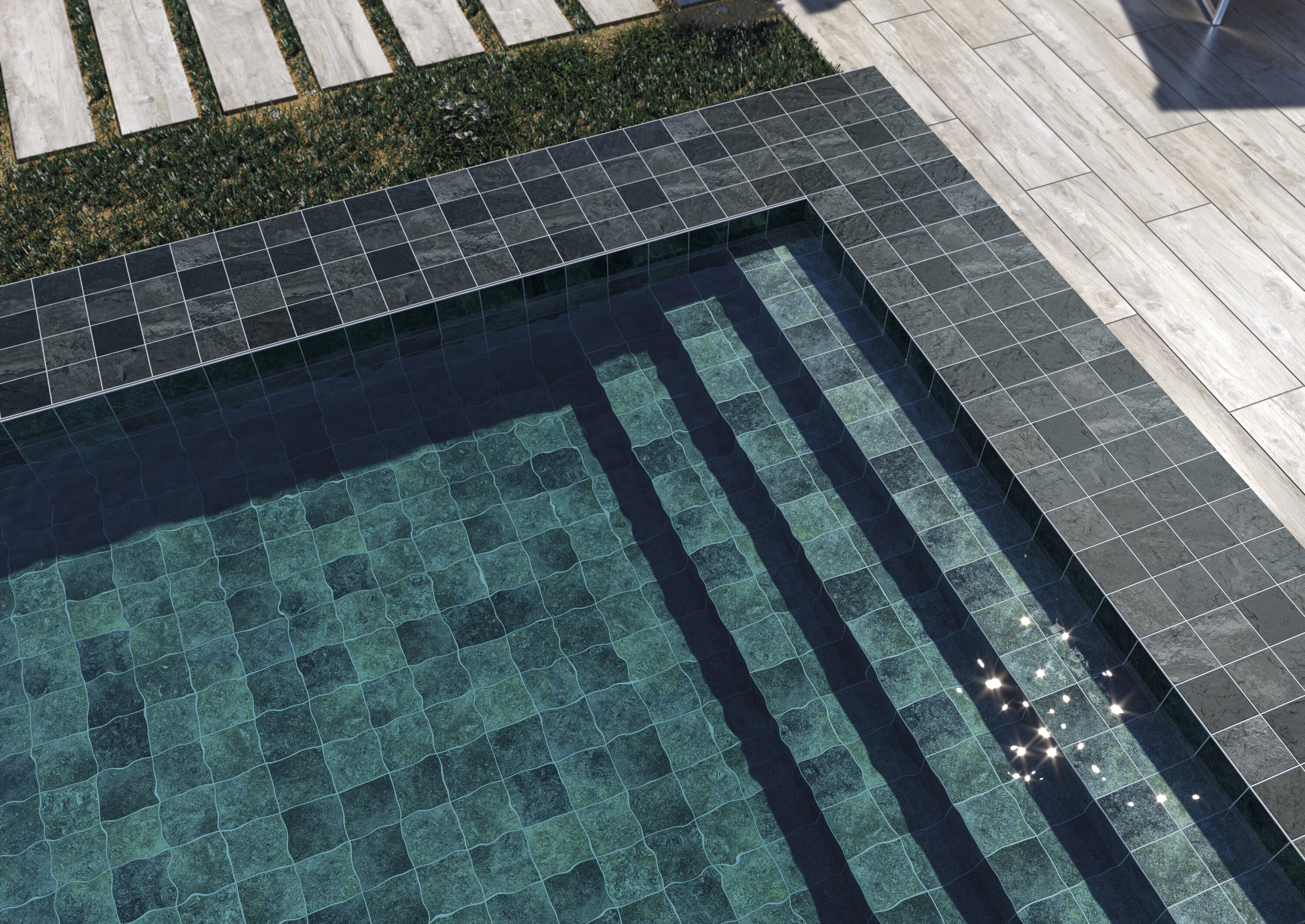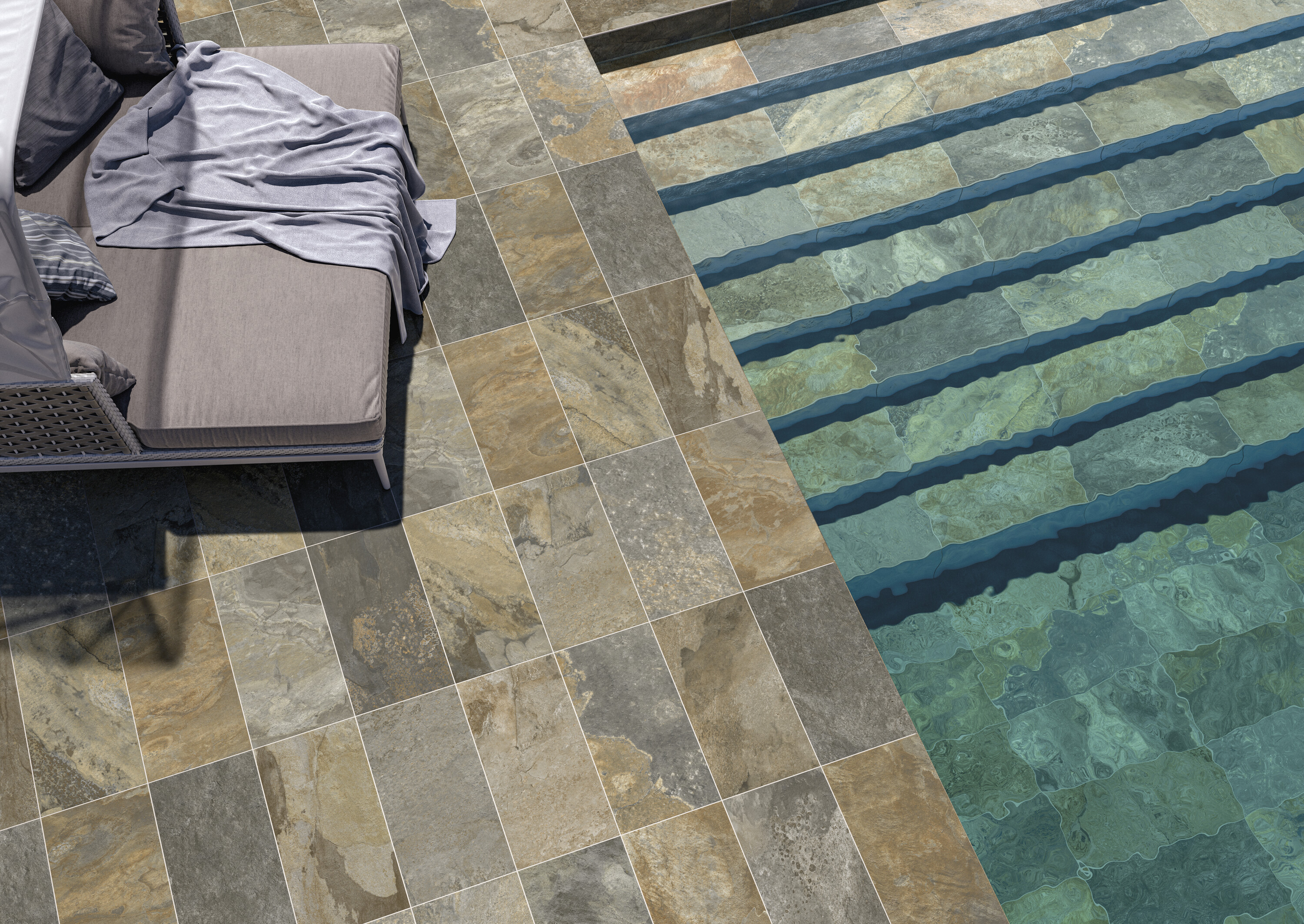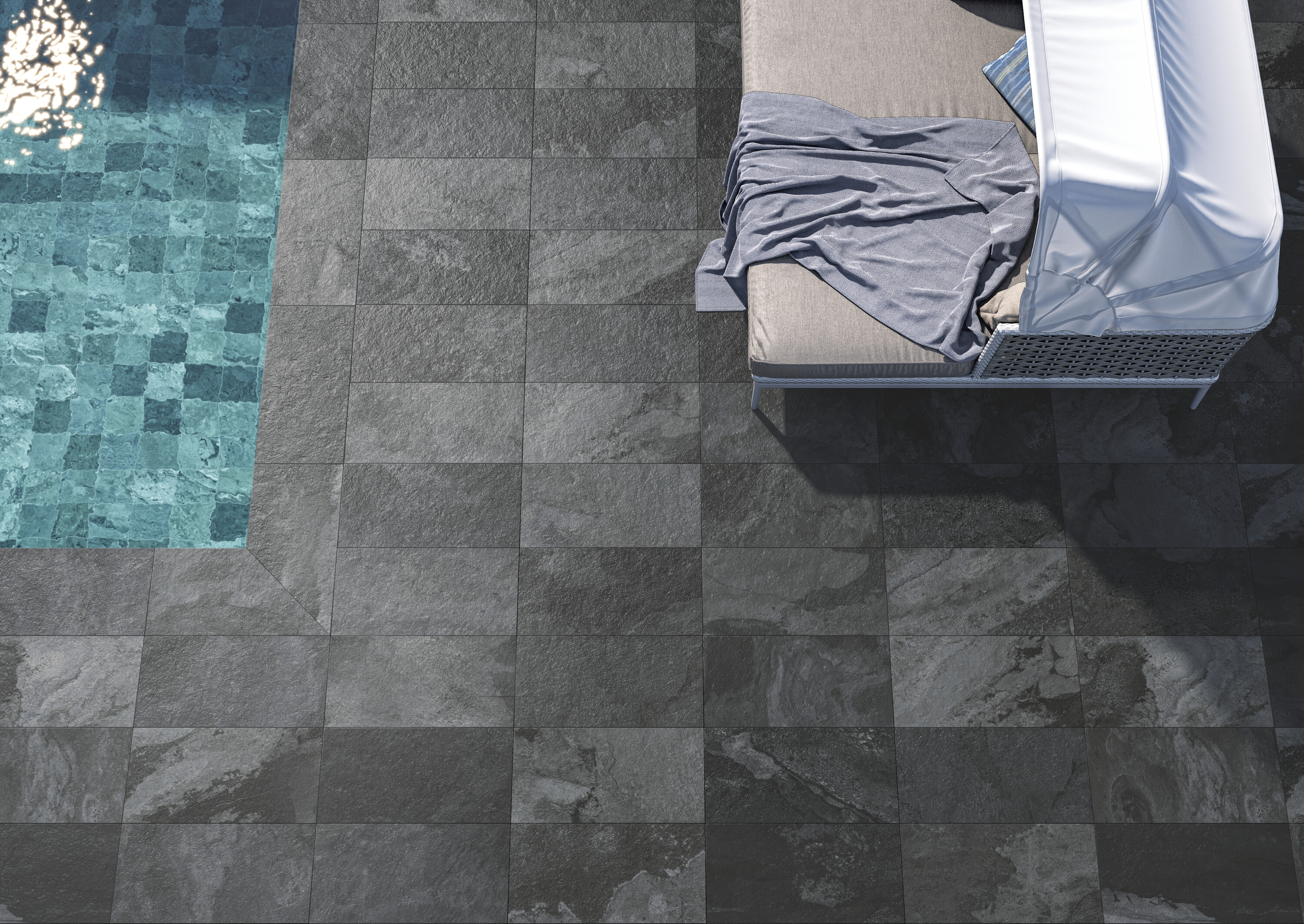 Противоскользящий керамогранит представлен в двух тонах и форматах. Малоформатная коллекция увеличила размер плиток для большей универсальности, сохранив идеальную применимость для бассейнов, террас и даже фасадов.