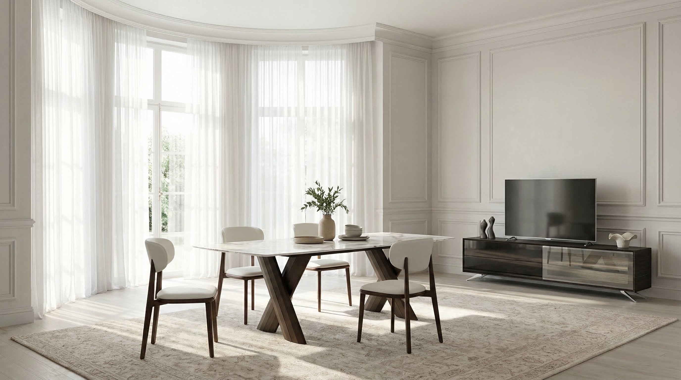 Оригинальное подстолье с пересекающимися металлическими опорами задаёт композиции динамичный силуэт. Дизайн будто собирает стол в единый центр, создавая ощущение баланса и устойчивости, но при этом оставляя пространство визуально открытым. Контраст линий и материалов делает коллекцию Cross впечатляющей даже в минималистичном окружении.