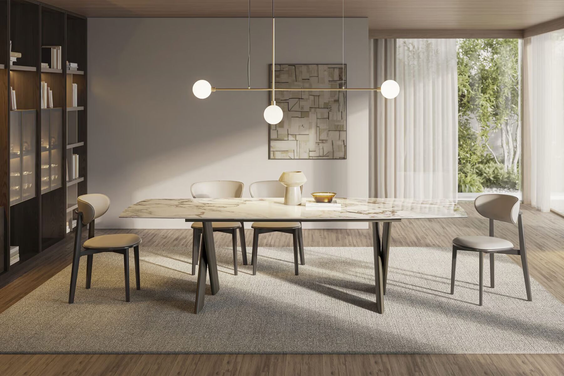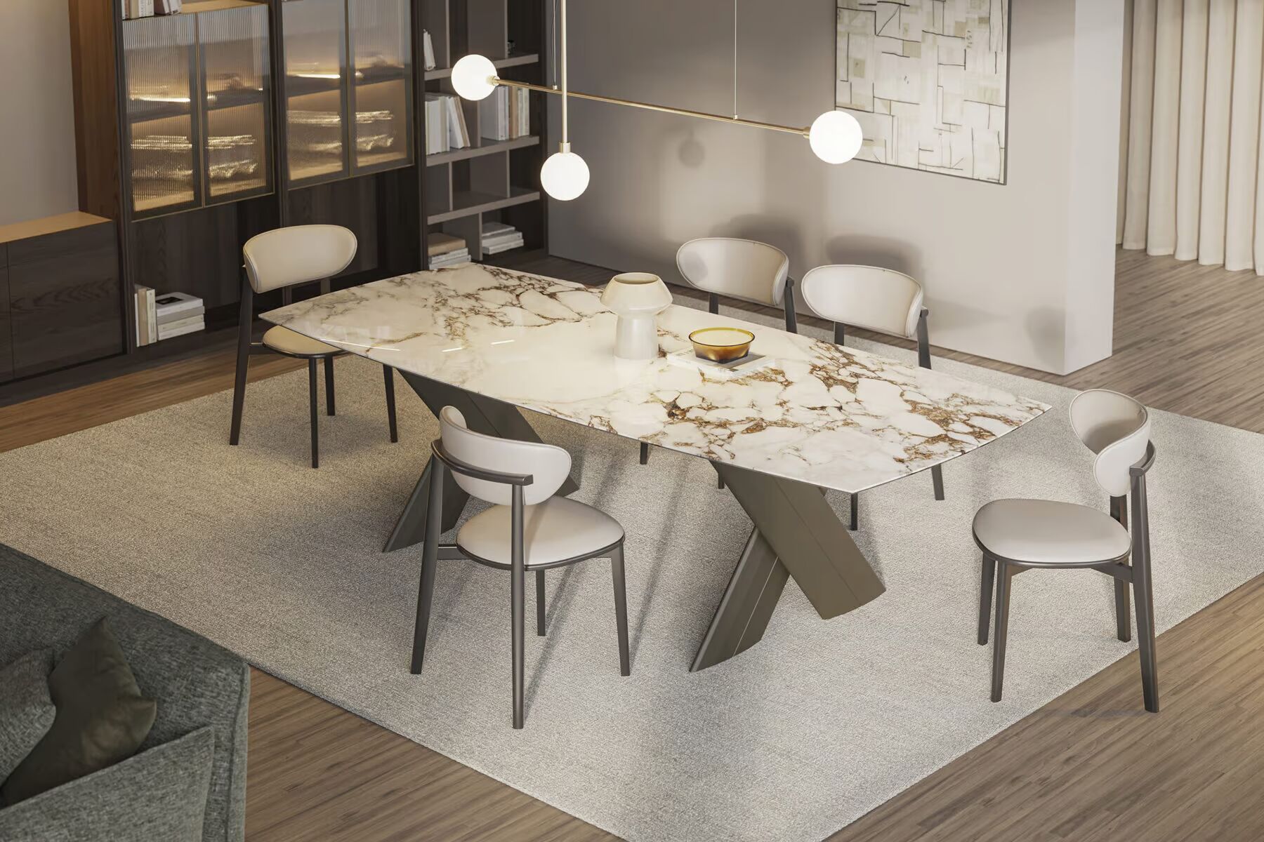Коллекция Cross — это выразительная интерпретация современного обеденного стола. Овальная столешница из керамогранита впечатляет мягким блеском поверхности. Она выглядит лёгкой, но остаётся невероятно прочной — идеальное сочетание эстетики и практичности для ежедневного использования.
