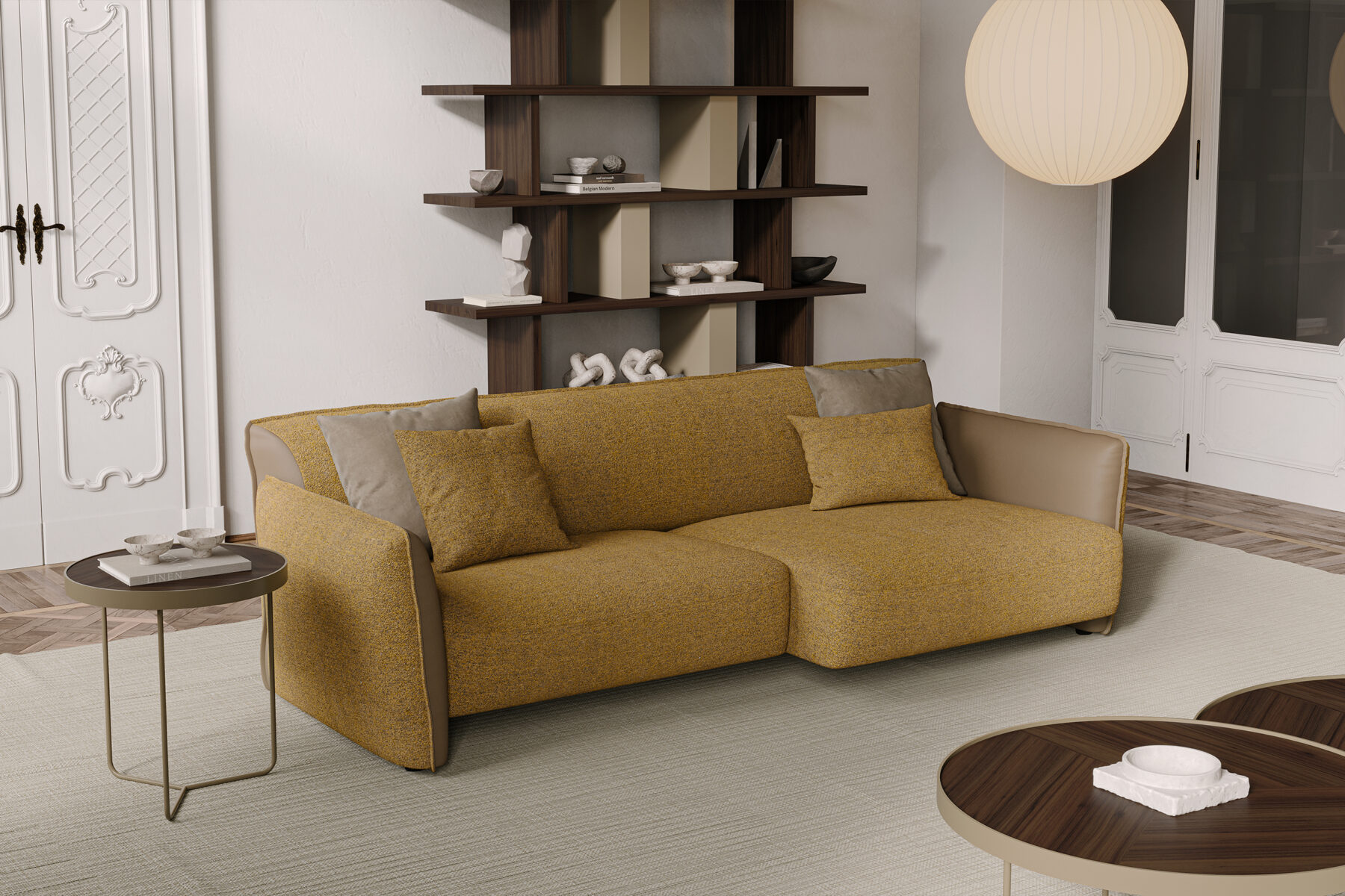 Модель имеет два вида отделки. Гладкая кожа и приятная на ощупь мягкая ткань — создают выразительный контраст. Благодаря этому диван не только выглядит дорого, но и дарит приятные тактильные ощущения. Вы получаете визуальное наслаждение, а также комфорт, который чувствуете кончиками пальцев.