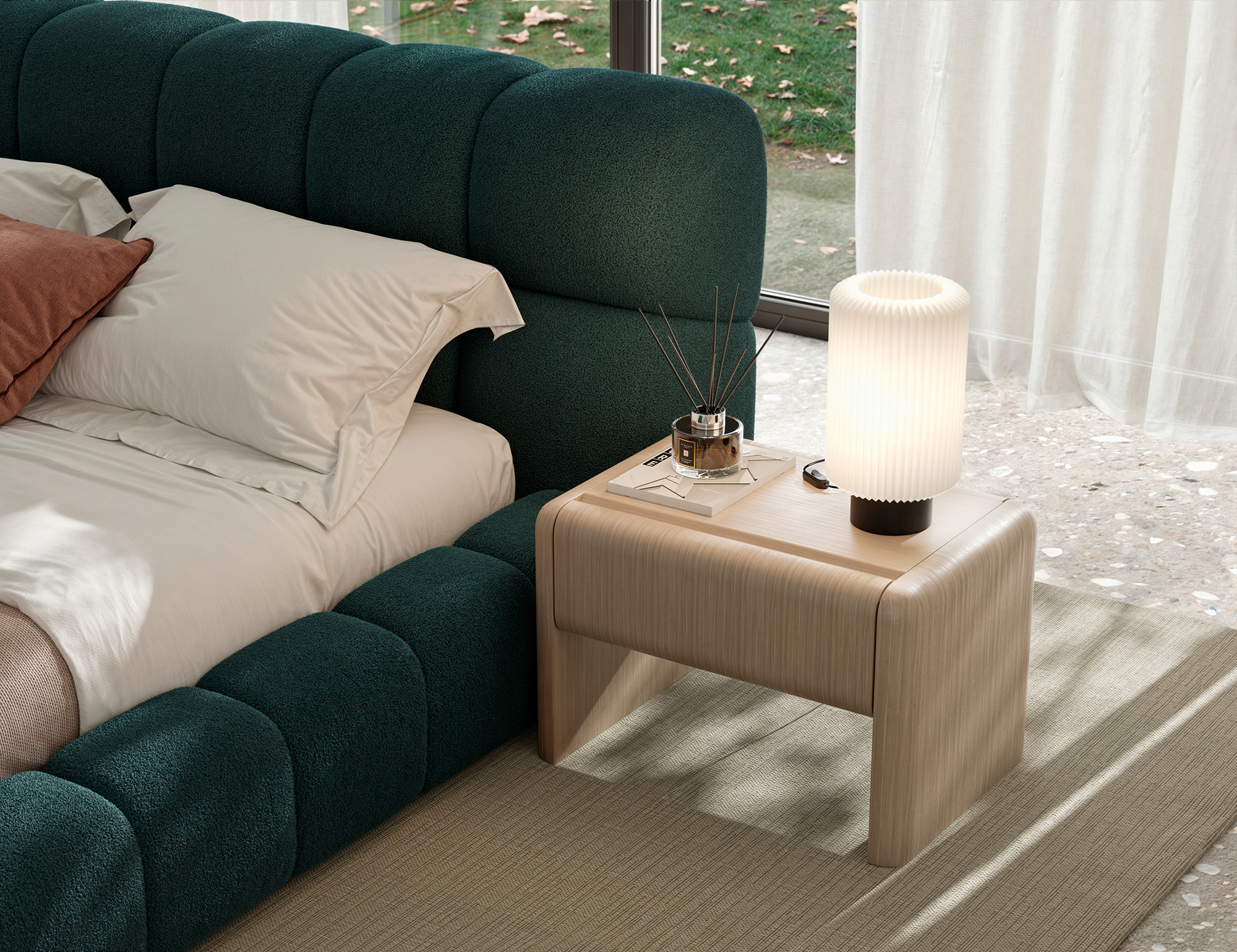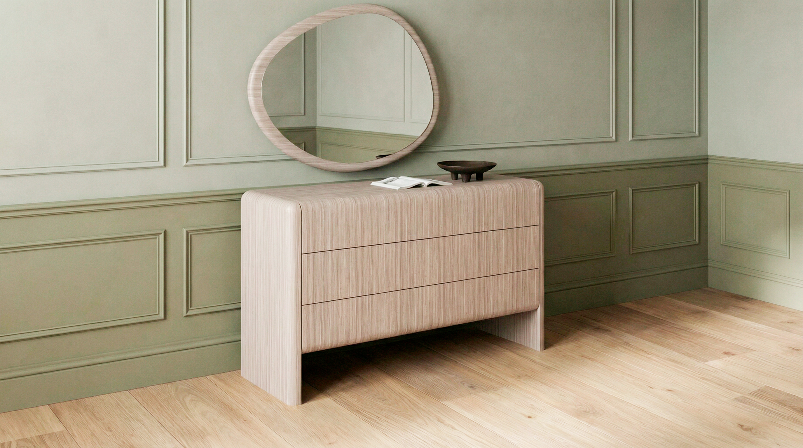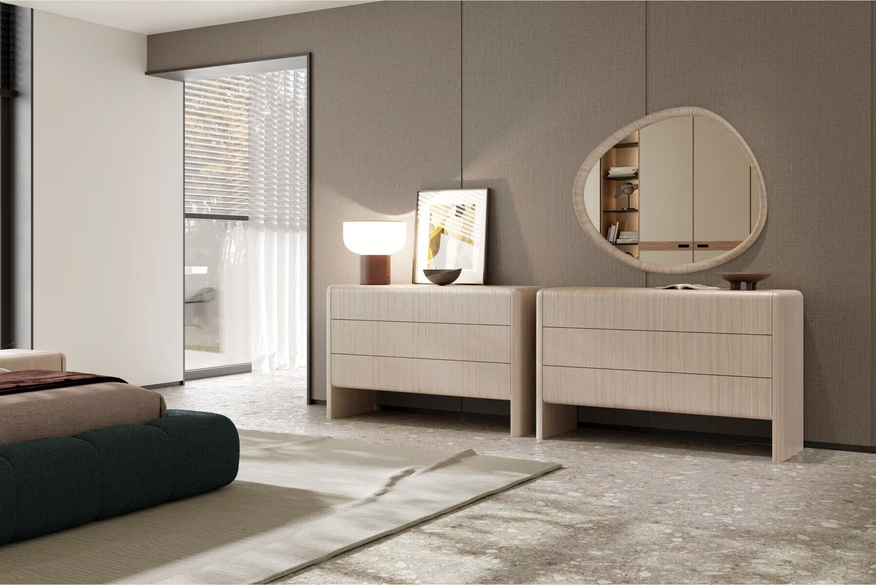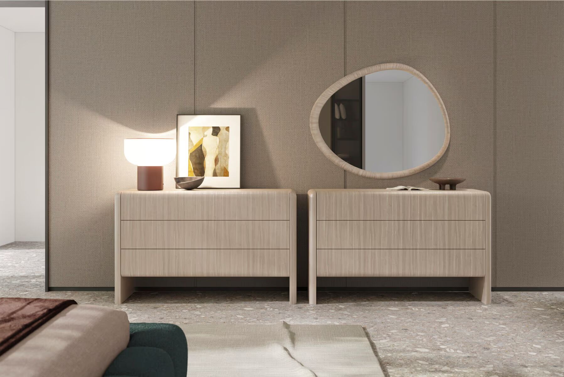 Каждый предмет коллекции — от прикроватных тумб до комодов — отличается продуманным дизайном, который смягчает интерьер и предлагает свежий взгляд на организацию пространства. Aqua помогает создать атмосферу спокойствия, где каждая деталь работает на ваш комфорт.