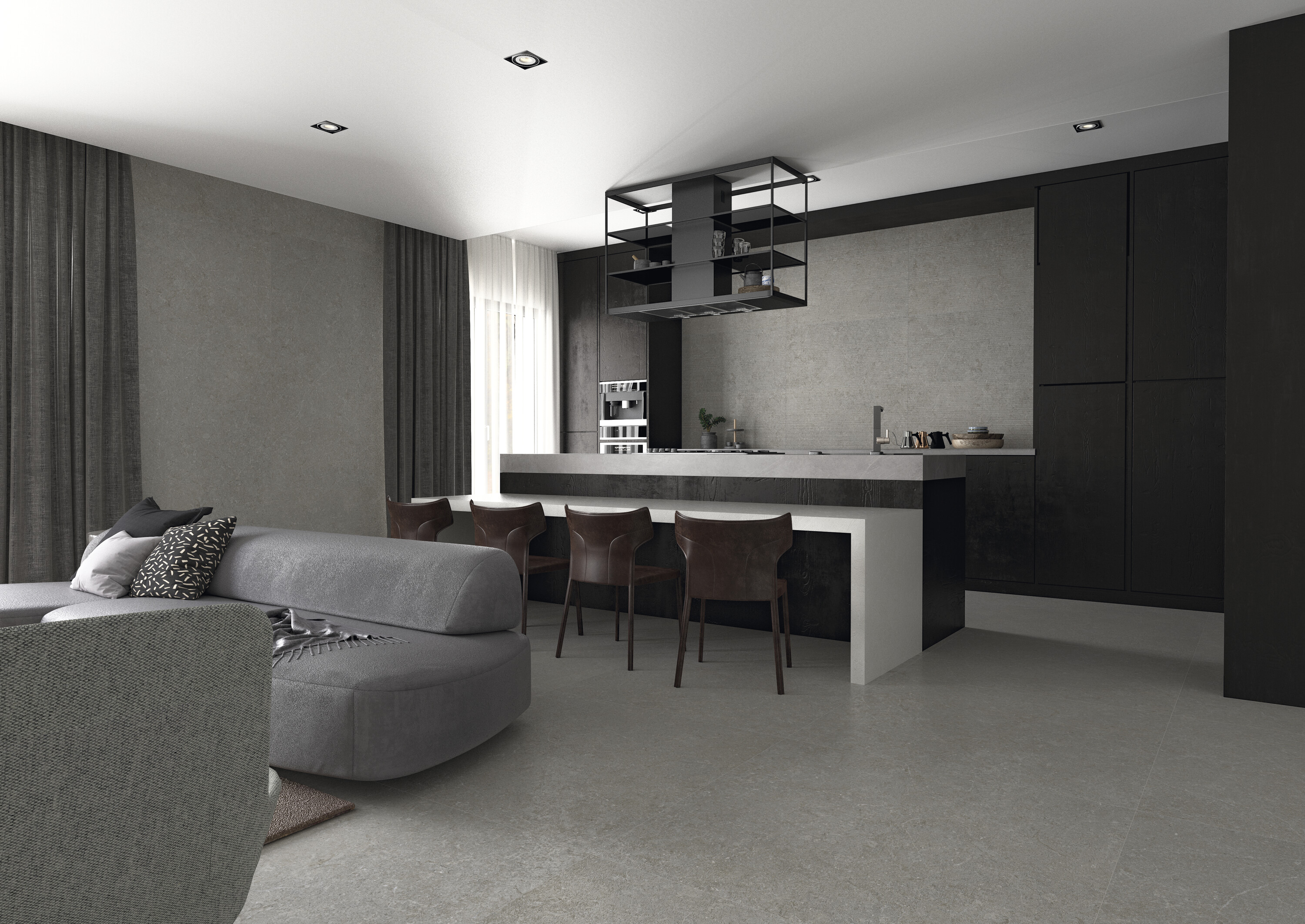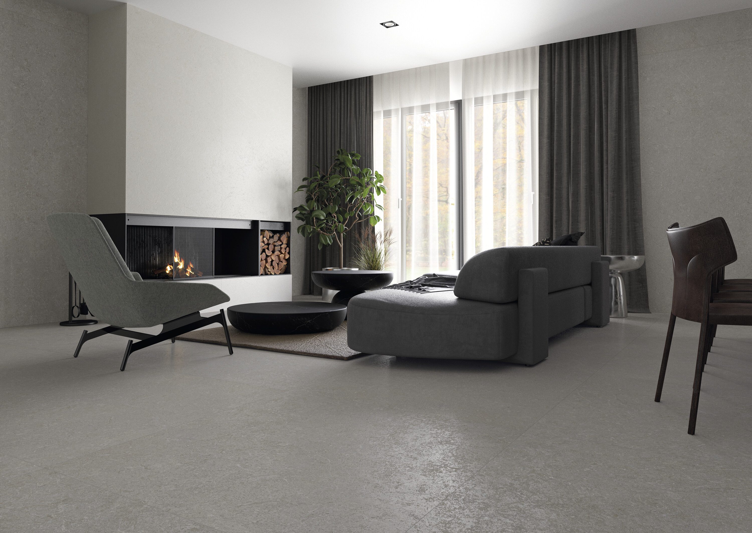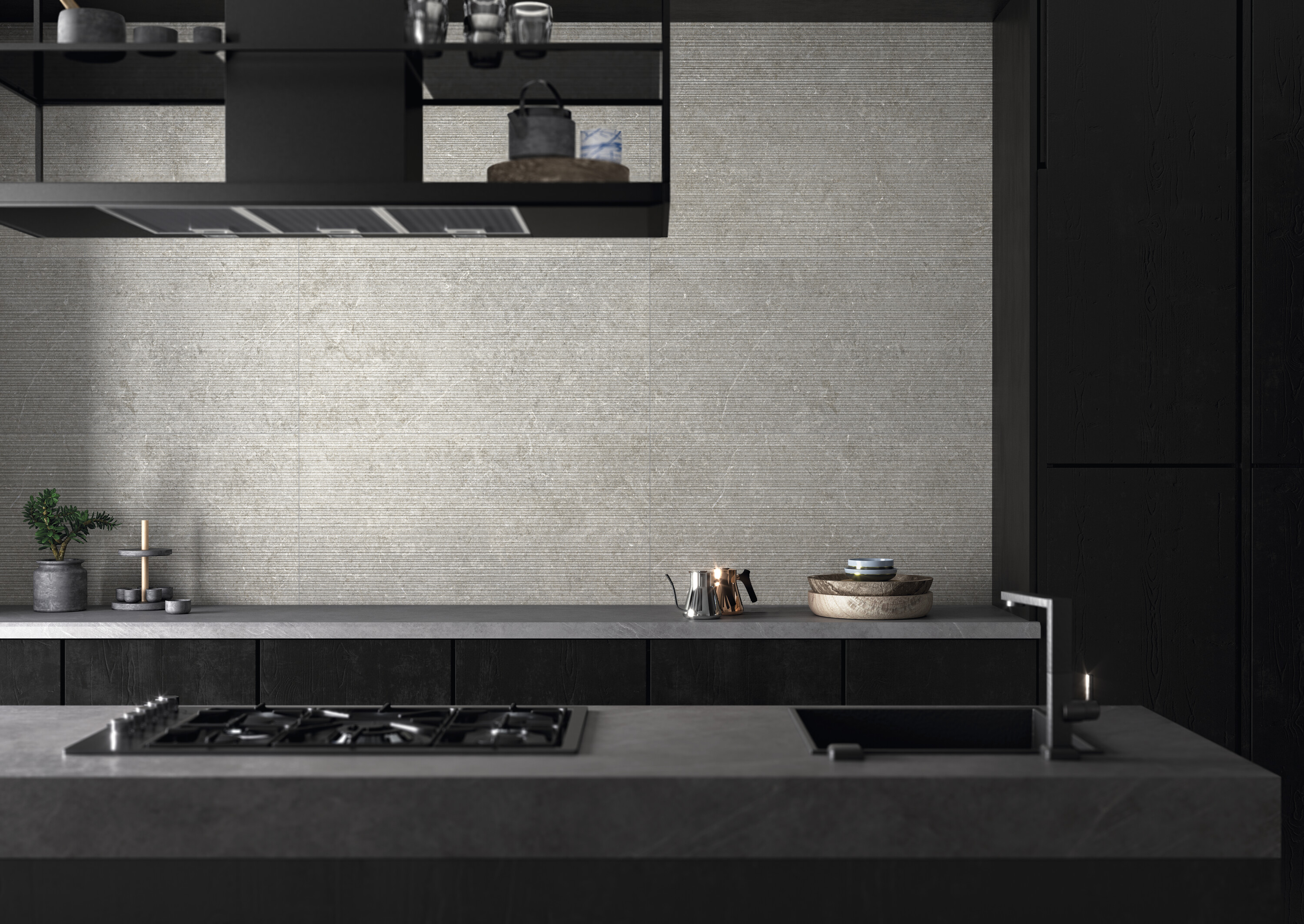 Нейтральная гамма из четырех оттенков представлена в диапазоне форматов от компактного 60×60 до впечатляющего 120×280 см.