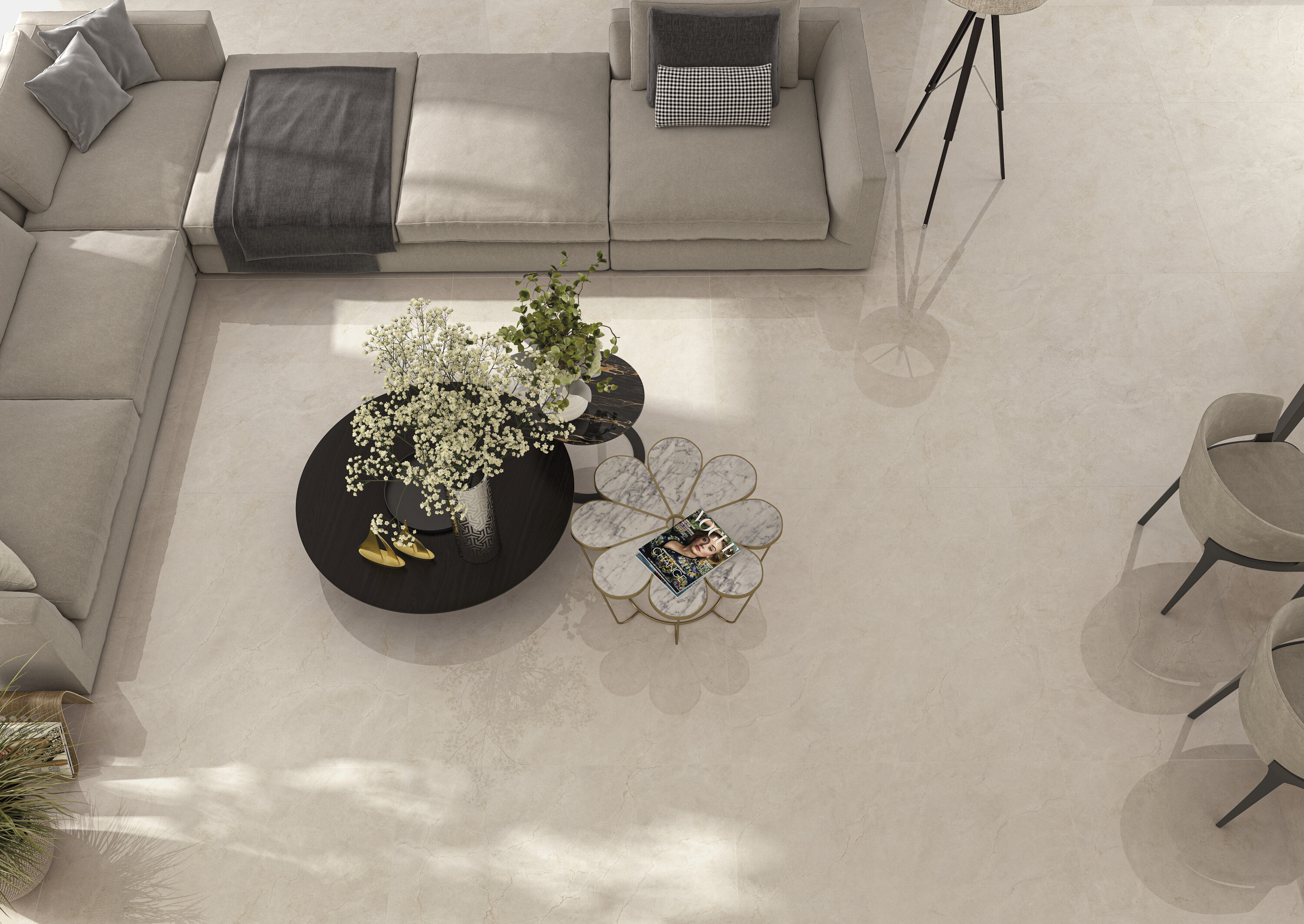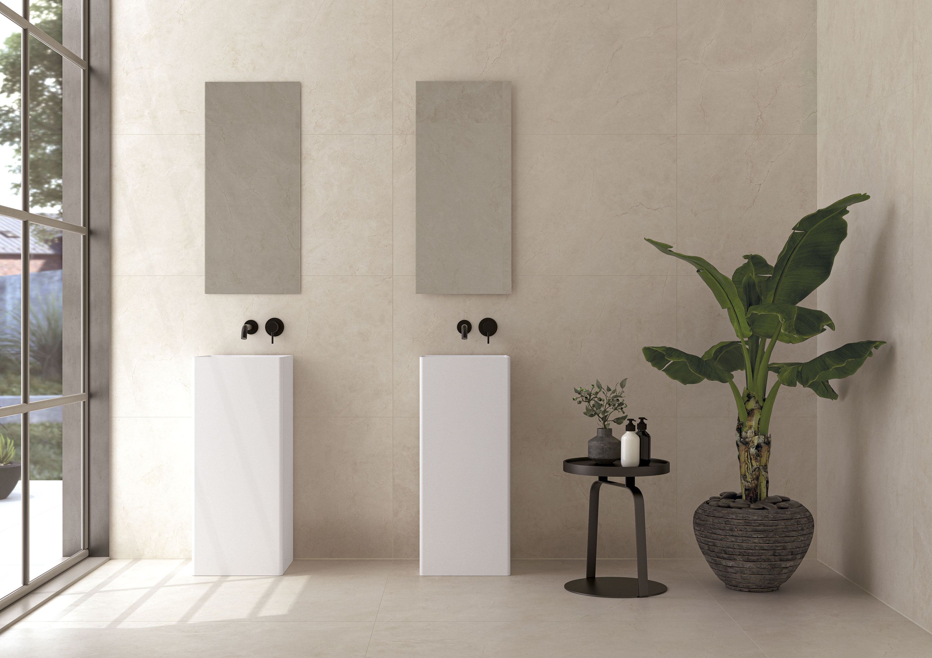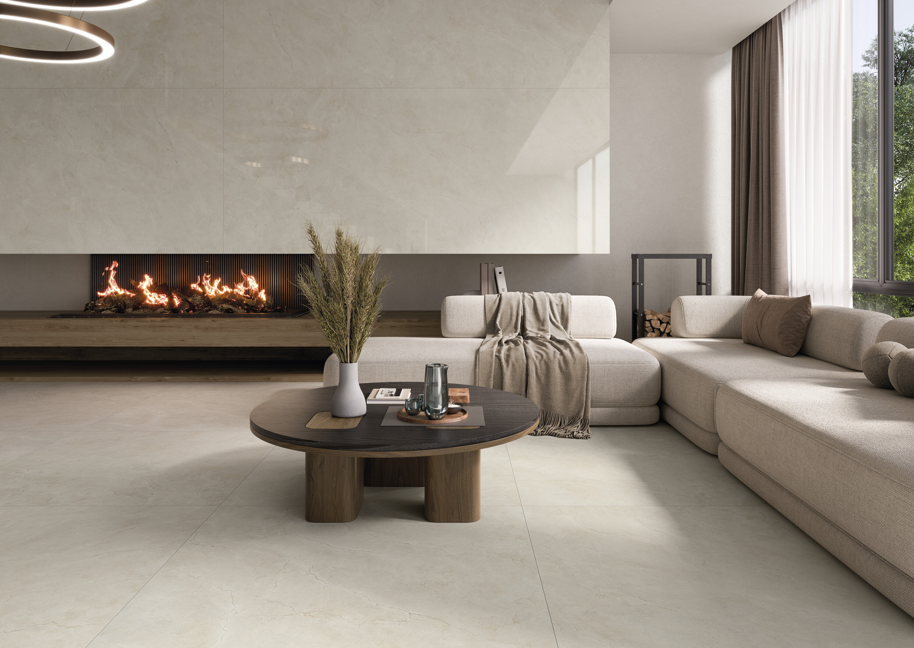 Плиты размером 120×120 и 120×280 см позволяют формировать бесшовные визуальные композиции. Два варианта отделки — матовая и полированная — предоставляют широкий выбор стилистических решений.