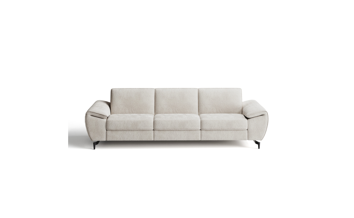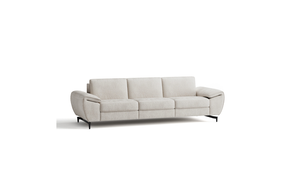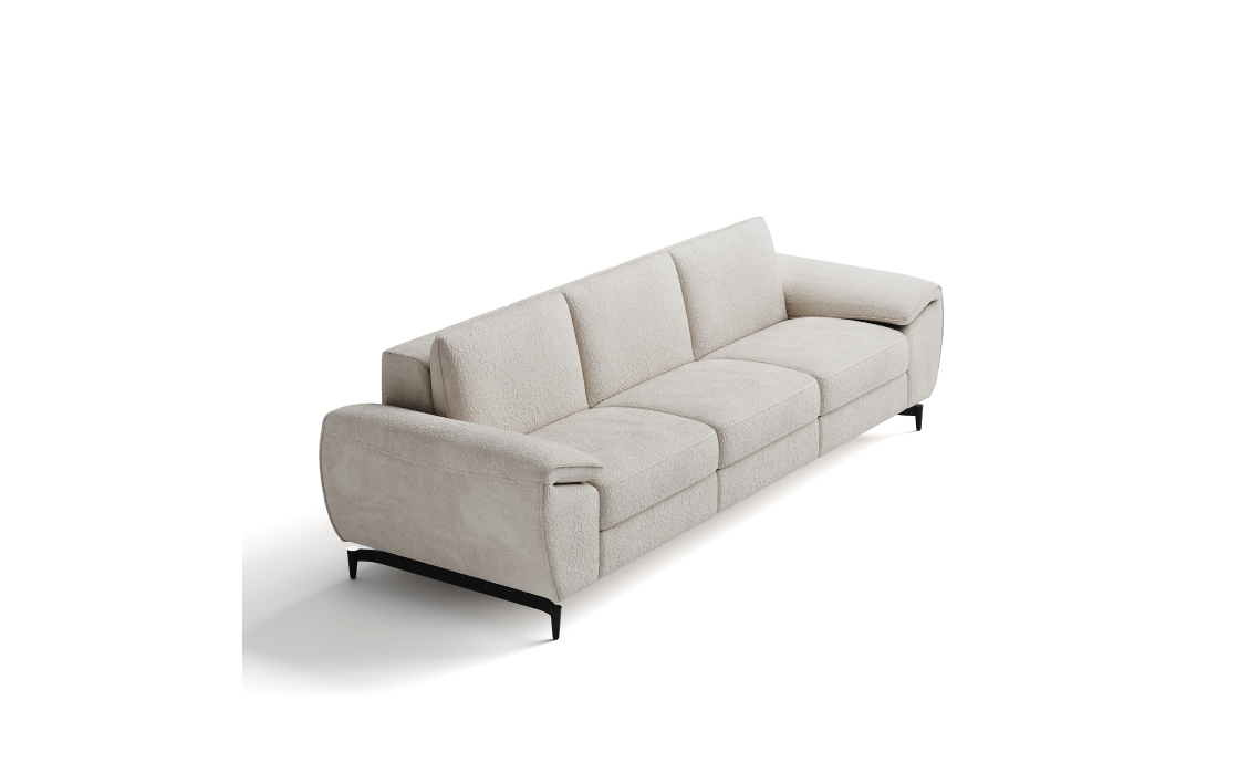 Спокойный цвет — настоящее наслаждение для глаз, а премиальная ткань букле подарит удивительные тактильные ощущения. Объемная форма подлокотников и спинки делает диван невероятно уютным. Лаконичные линии и дизайнерские черные ножки, выполненные из металла, усиливают эстетику модели.