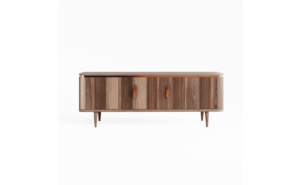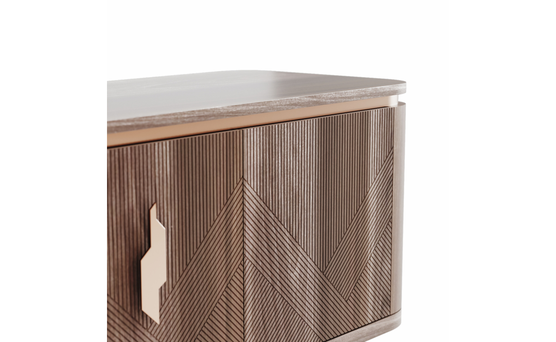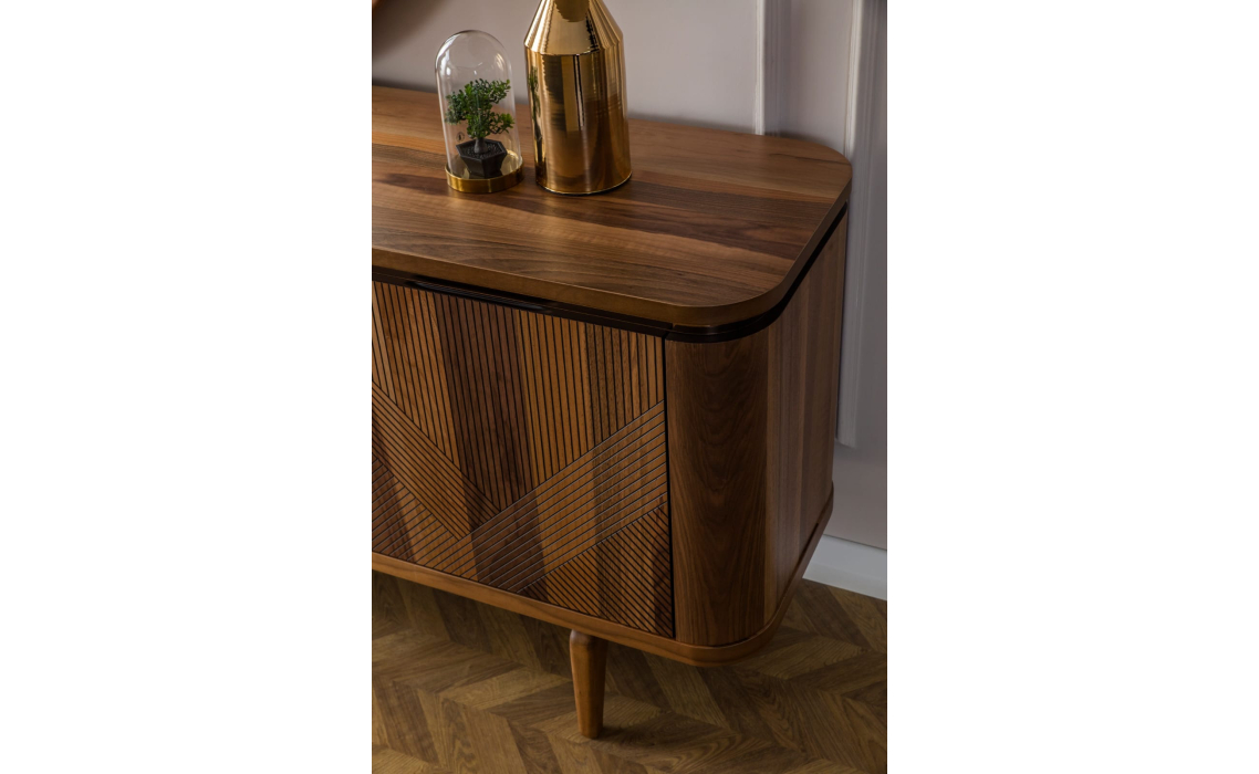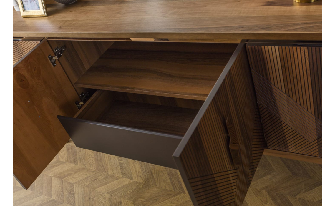 Комод Ronda выделяется превосходным качеством используемых материалов и оригинальным рустикальным стилем. Фасад с необычным узором из пересекающихся линий сразу привлекает взгляд. Металлическая фурнитура золотистых оттенков гармонично дополняет шпон благородной ореховой древесины.