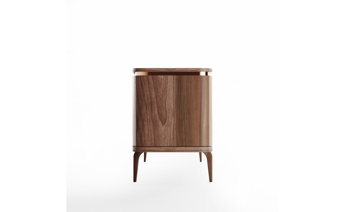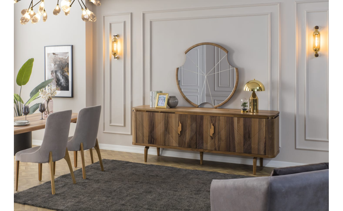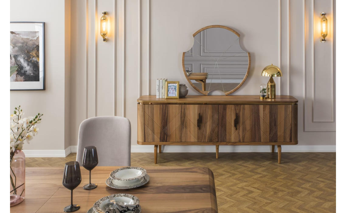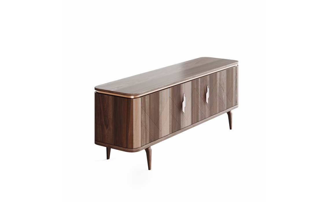 Комод Ronda выделяется превосходным качеством используемых материалов и оригинальным рустикальным стилем. Фасад с необычным узором из пересекающихся линий сразу привлекает взгляд. Металлическая фурнитура золотистых оттенков гармонично дополняет шпон благородной ореховой древесины.