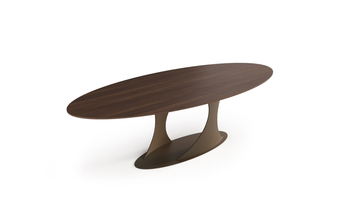 Изюминка стола — изысканное подстолье с плавными линиями. Природный рисунок шпона и игра тонов соответствуют тренду на сдержанную роскошь, подчеркивая статусность вашего интерьера.