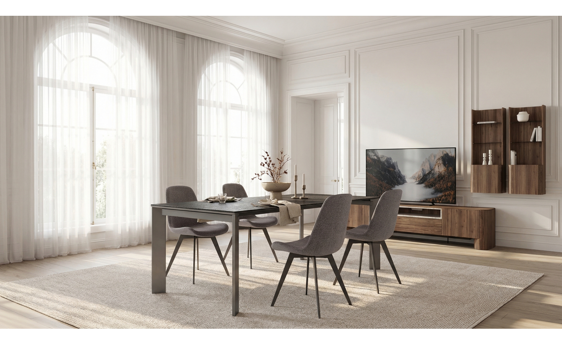 Дизайнерский обеденный стол VERTEX подойдет для современных интерьеров. У модели прочная и устойчивая к царапинам столешница из керамогранита, а также металлическое подстолье. Стол имеет брутальный облик благодаря строгой форме и графитовому оттенку.
