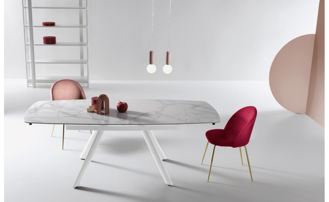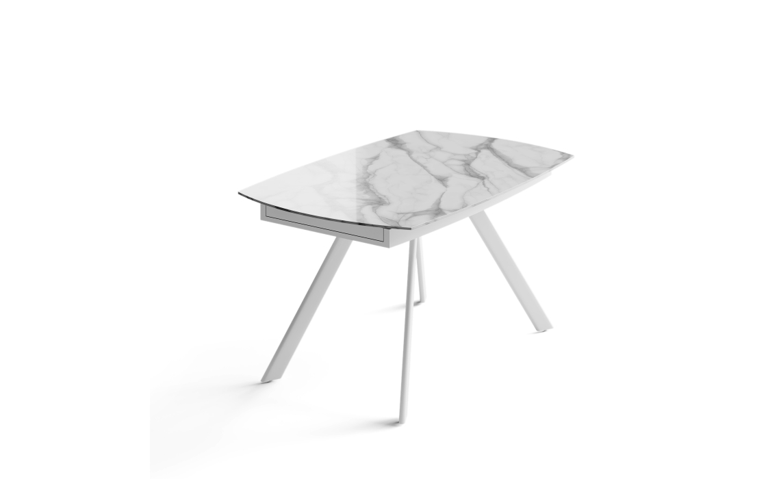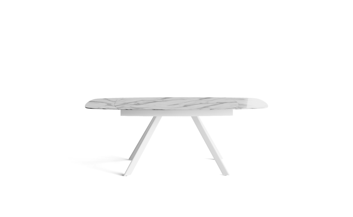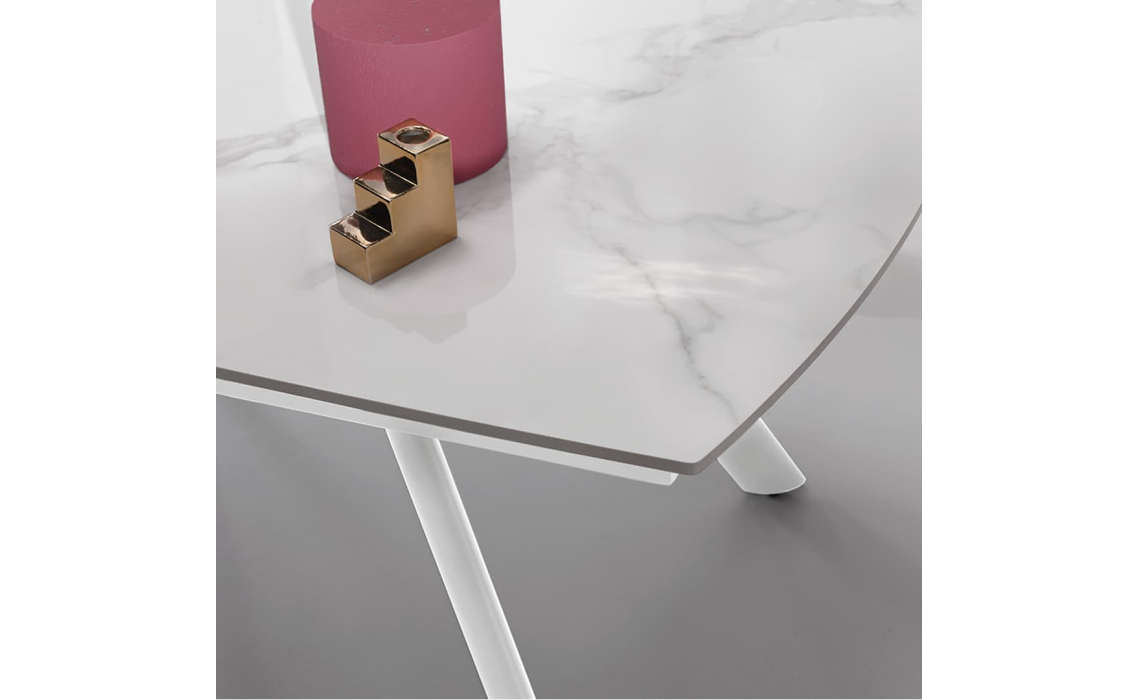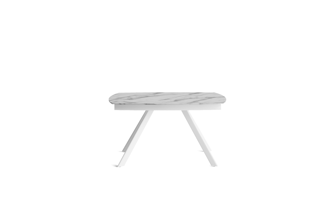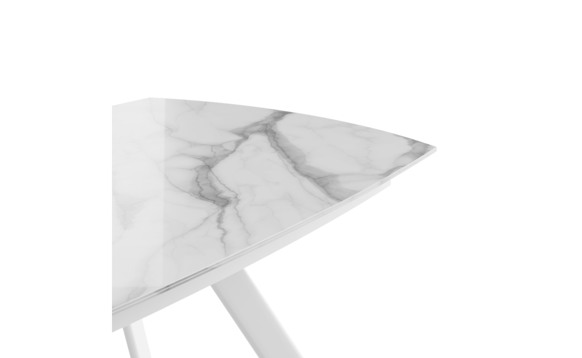 Глянцевая столешница выполнена из керамогранита, материал отличается высокой прочностью, экологичностью и красотой. Надежное металлическое подстолье дополняет облик модели и гарантирует устойчивость. Стол благородного белого оттенка подчеркивает утонченность обеденной зоны.