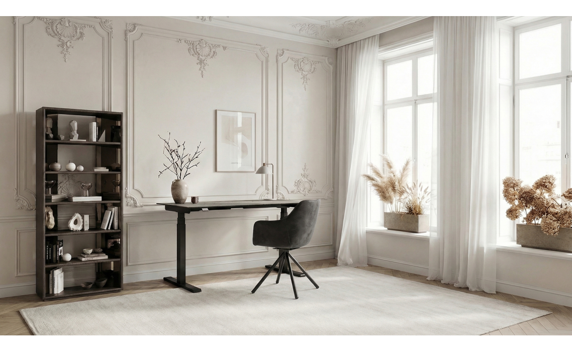 Письменный стол WORK вдохновляет на продуктивность. Стол выполнен из прочного керамогранита, материал устойчив к царапинам и экологичен. Модель регулируется по высоте, благодаря этому можно легко найти идеальную высоту для комфортной работы в сидячем или стоячем положении.