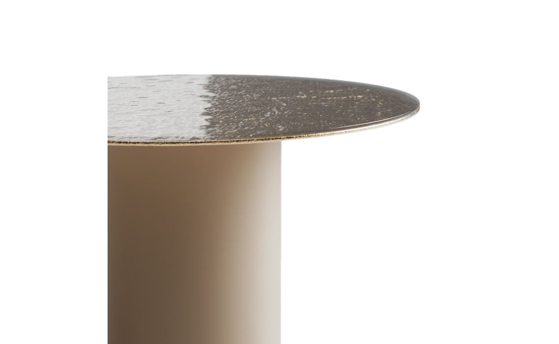 Теплый бронзовый оттенок столешницы с рельефной поверхностью дарит модели дополнительное обаяние. Бежевый цвет опоры завершает безупречный облик стола.