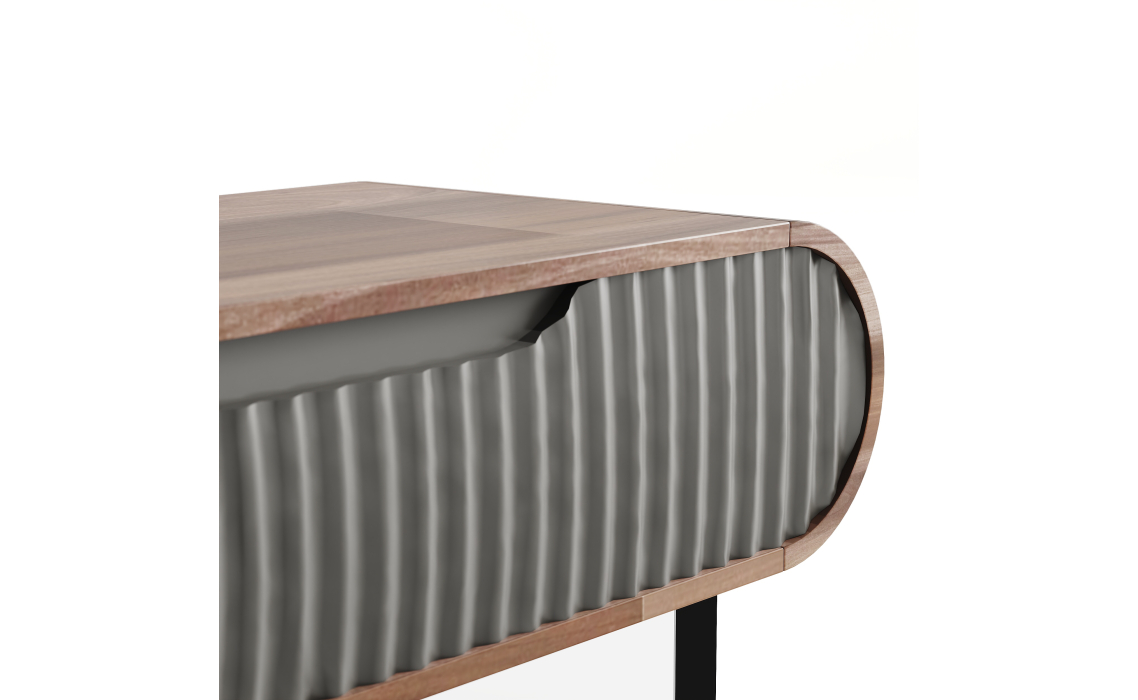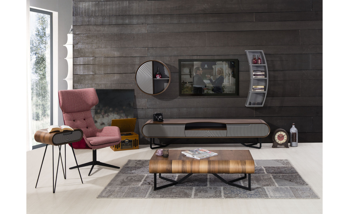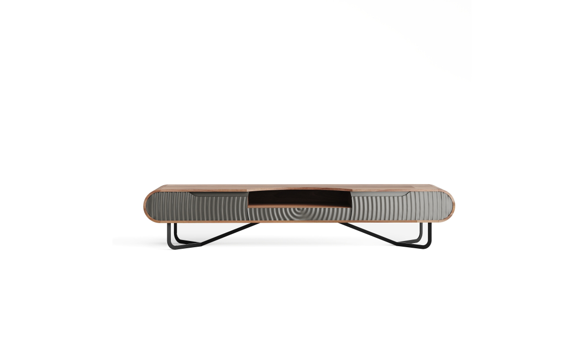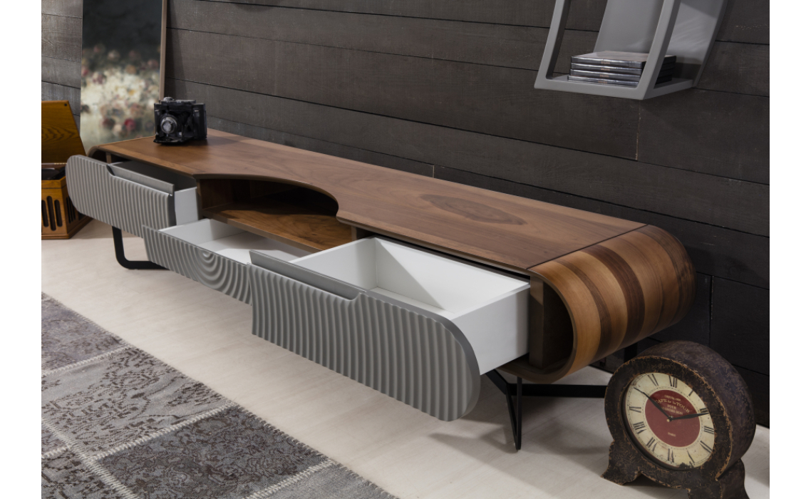 Эксклюзивная тумба под ТВ LOFT привносит в интерьер эклектичную демократичность. Корпус тумбы выполнен из шпона цвета грецкого ореха. Рельефная эмаль и дизайнерская опора создают оригинальный облик изделию, которое призвано стать центральной частью пространства.