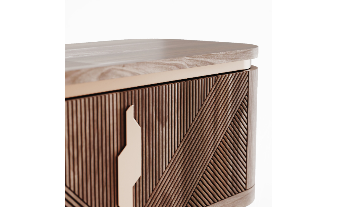 Тумба под ТВ RONDA эффектно украсит интерьер. Модель обладает уникальным стилем благодаря мягкой округлой форме и рифленому фасаду из дерева. Корпус тумбы выполнен из натурального шпона, который подчеркивает естественную текстуру и добавляет изысканности.