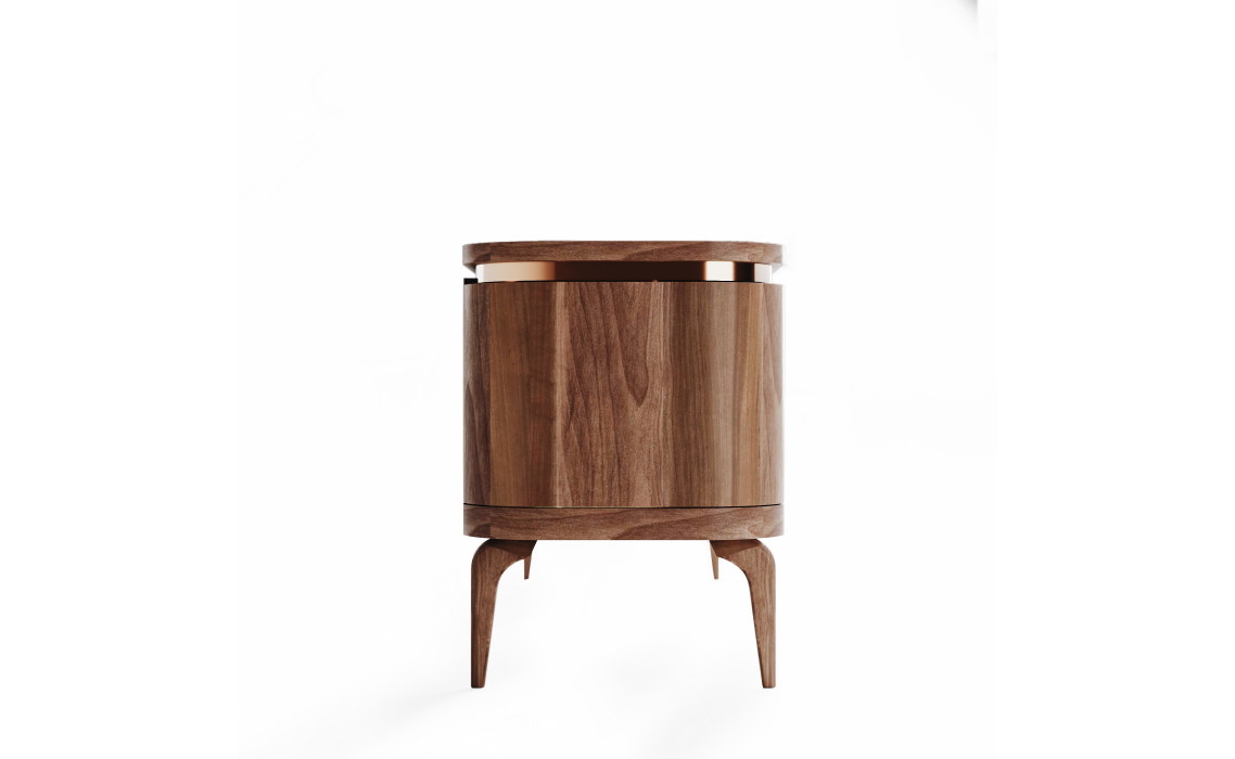 Деревянные ножки поддерживают экологичный образ изделия. Металлические элементы, окрашенные в золото, придают тумбе эксклюзивный и роскошный вид, делая ее центральным акцентом в комнате.