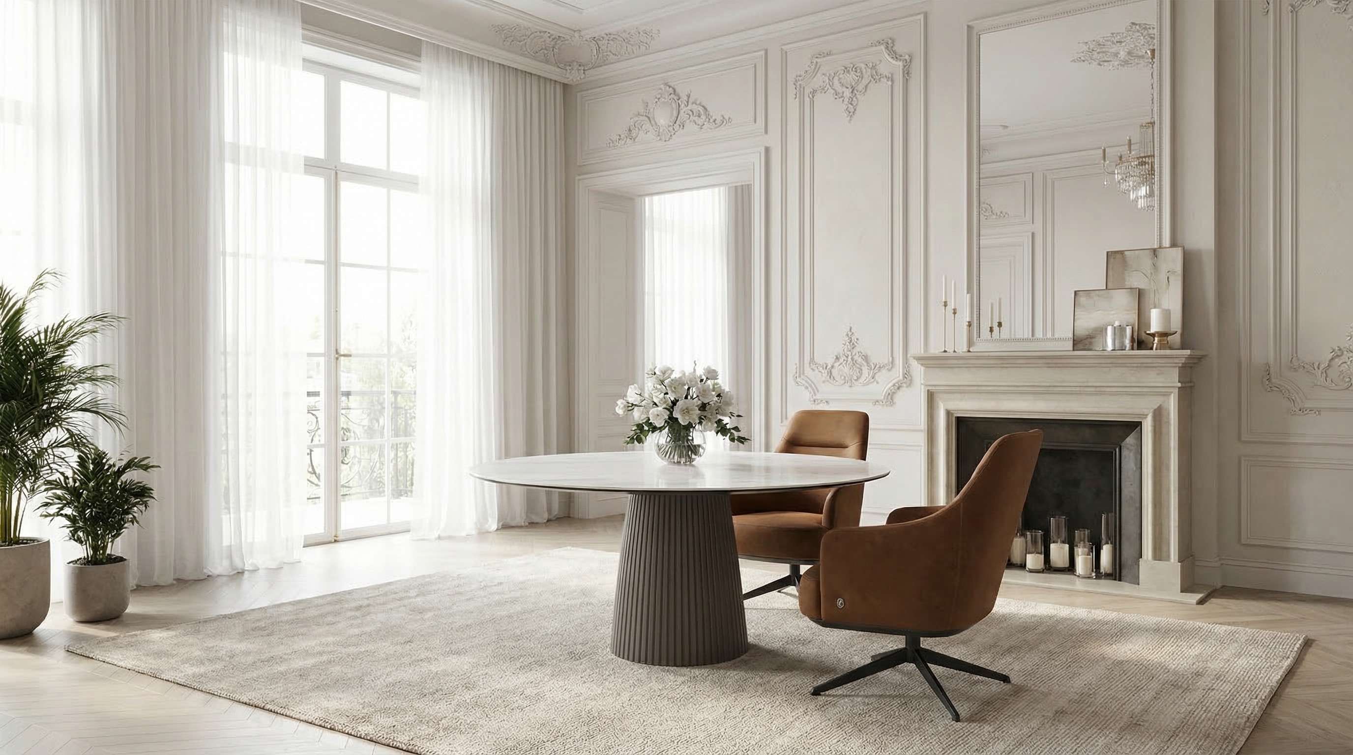 Центральная опора с ритмичной вертикальной фактурой выступает в роли самостоятельного дизайнерского элемента. Столы Pilea подходят для обеденных зон, где важна атмосфера общения и визуальное спокойствие.Столы Pilea