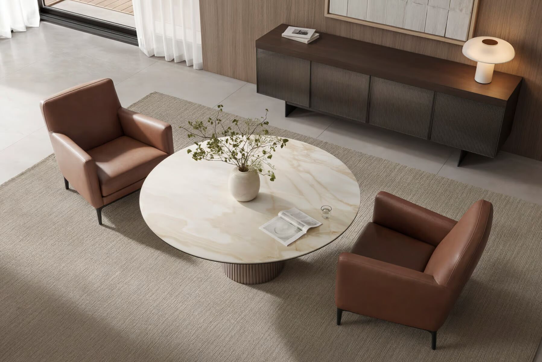 Коллекция Pilea выделяется изысканным силуэтом. Столы имеют стильный дизайн: круглая столешница и выразительная опора, которые привносят в современный интерьер утонченный баланс между монументальностью и изяществом.