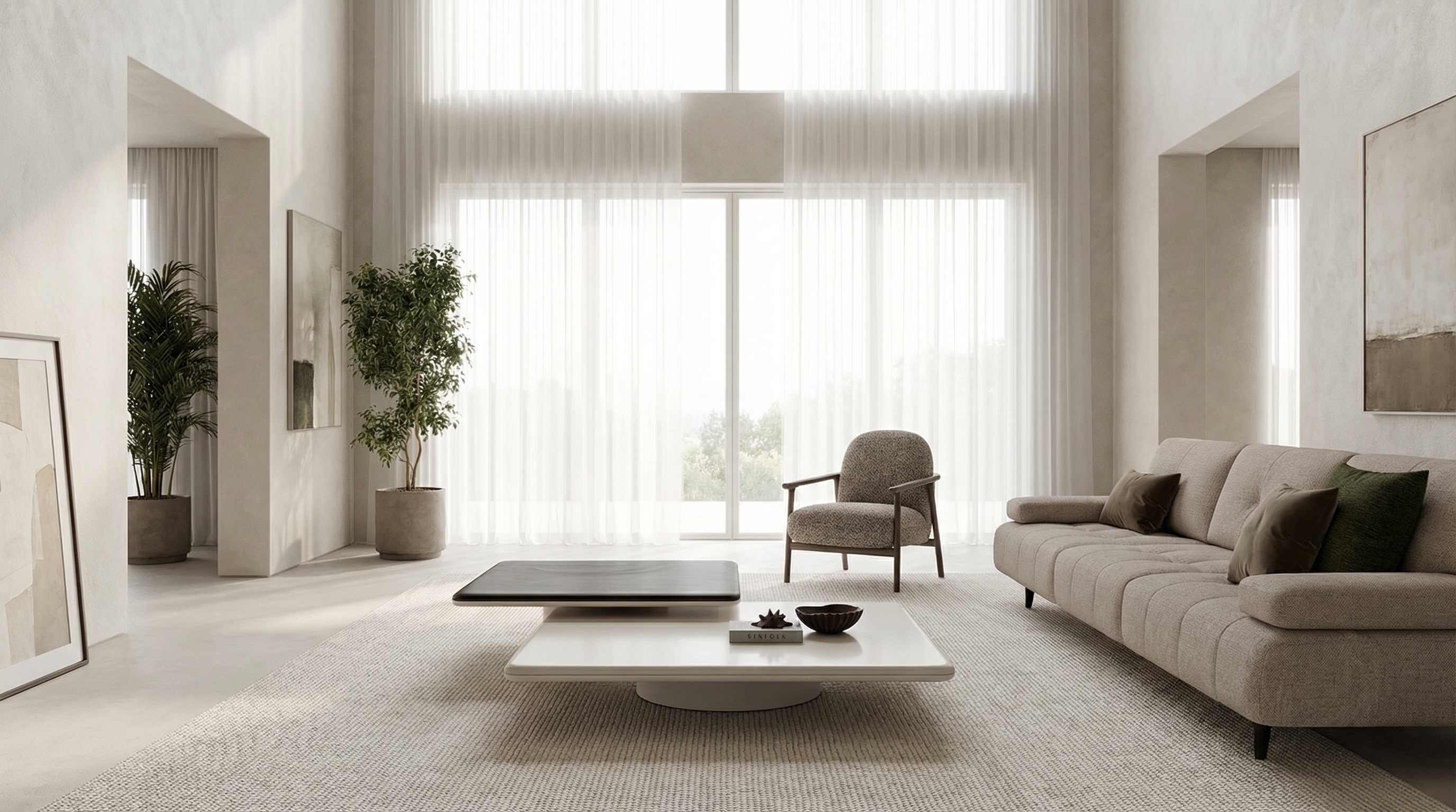Многоуровневая конструкция раскрывает глубину формы: столешницы словно парят одна над другой, опираясь на лаконичное основание. Такое решение добавляет динамику и позволяет по-разному организовывать пространство — от камерной зоны отдыха до открытых лаунж-интерьеров.