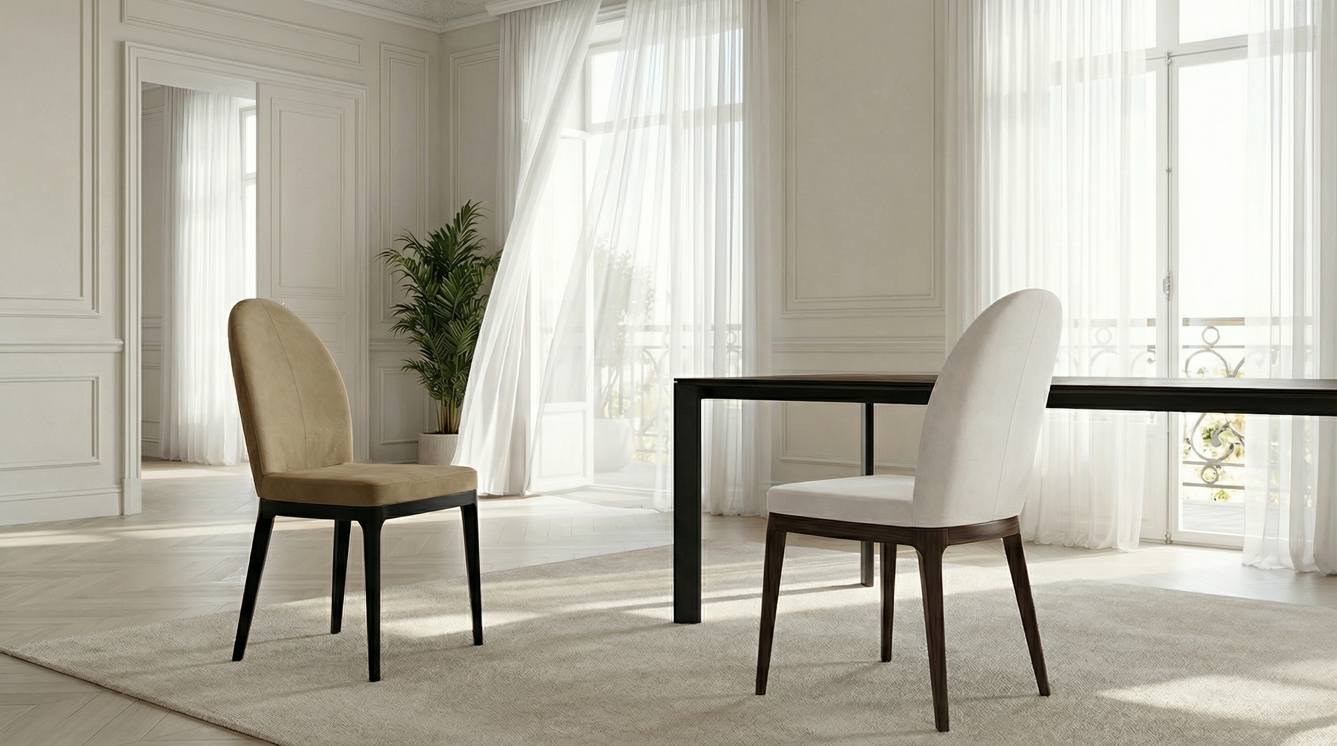 Мягкая обивка подчеркивает округлые линии, создавая гармоничный образ. Стул словно выстроен вокруг идеи комфорта. Компактные пропорции позволяют легко интегрировать мебель в обеденные зоны, кухни или камерные пространства.