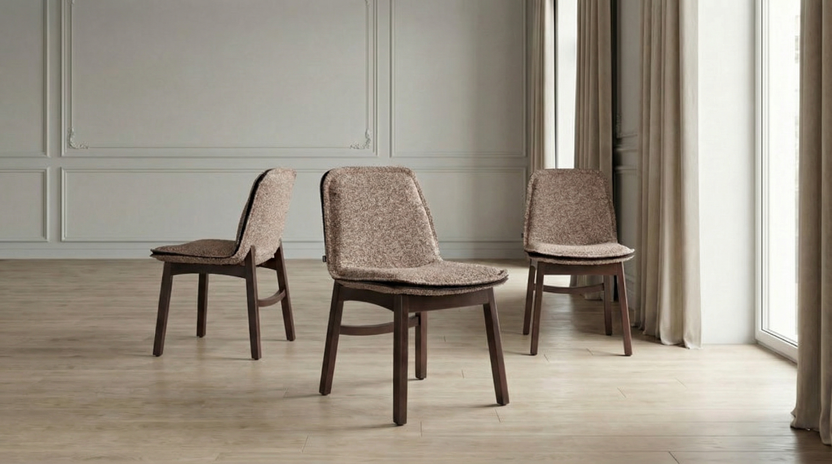 Мягкая посадка и продуманная геометрия спинки создают комфорт. Обивка с деликатной текстурой добавляет глубину образу, а лаконичный каркас делает мебель универсальной для разных интерьерных сценариев.