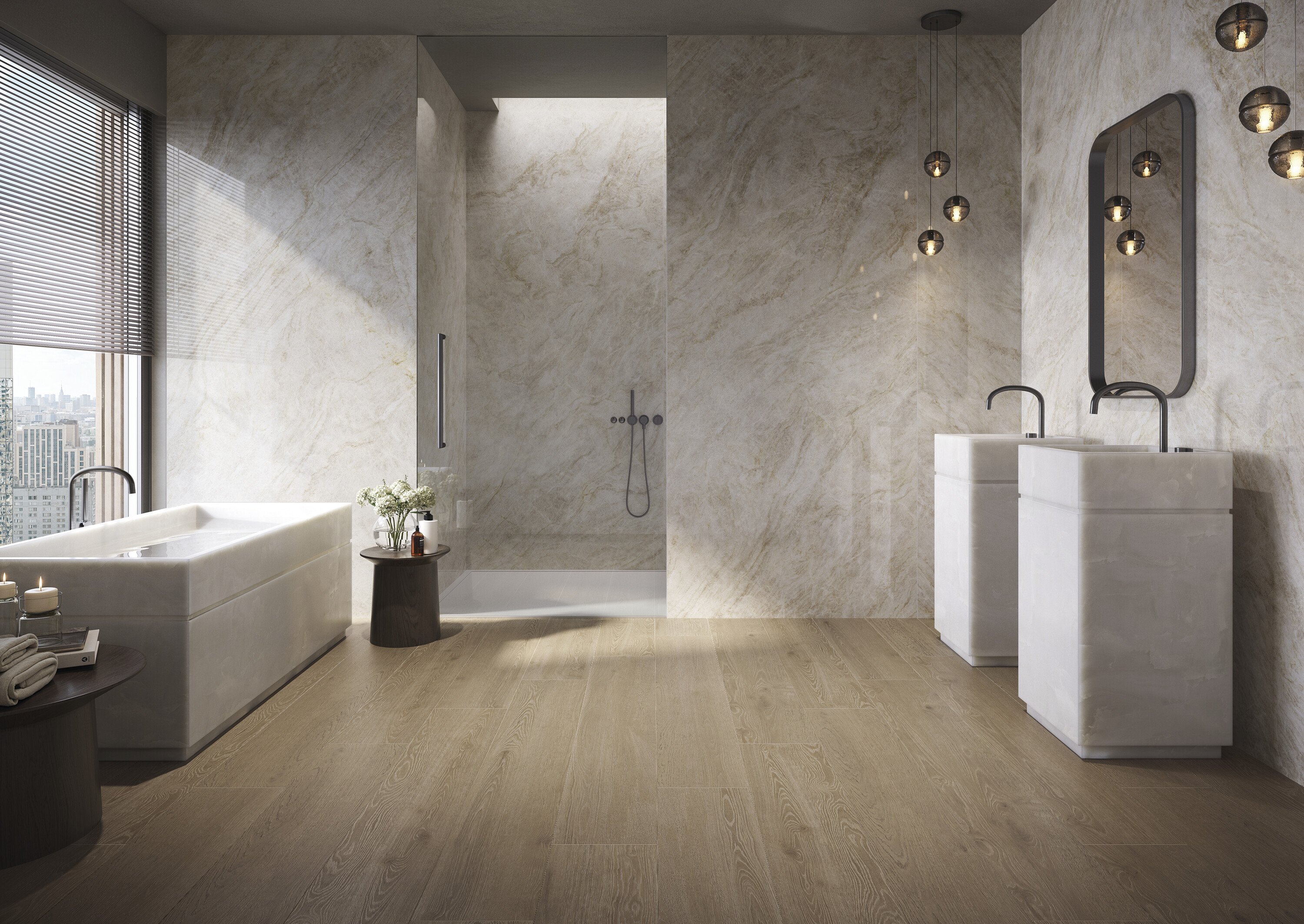 Три формата и два варианта обработки поверхности обеспечивают адаптацию к различным проектным требованиям. Крупноформатные решения позволяют создавать монументальные пространства с эффектом бесшовности.