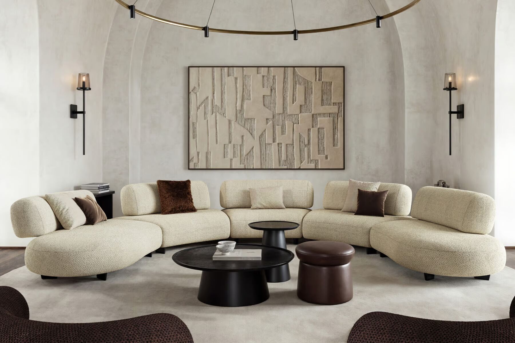 Особую выразительность коллекции придают дизайнерские опоры. Они выполнены в виде массивных, но визуально мягких оснований, напоминающих скульптурные объёмы. Такая конструкция создаёт ощущение устойчивости и спокойной основательности. Баланс пропорций делает каждый стол частью продуманной композиции.